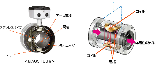 MAG5100W是适合于测量上下水道、排水、灌溉用水、工业用水、空调循环水、冷水等的廉价型。“法拉第电磁感应定律”是指,导电物体在磁场中移动时,物体内会产生电动势。将其作为电磁流量计的测量原理时,请考虑使用导电液体而不是感应物体,并安装电极以将产生的电动势提取到外部。